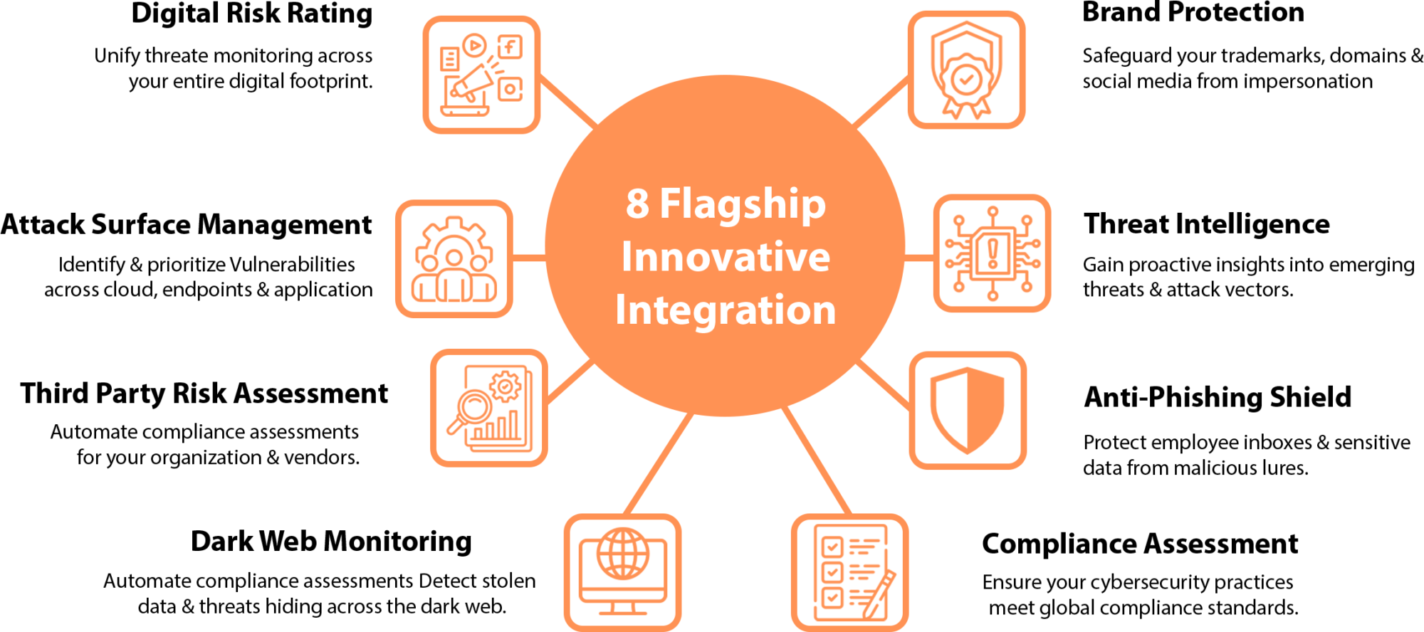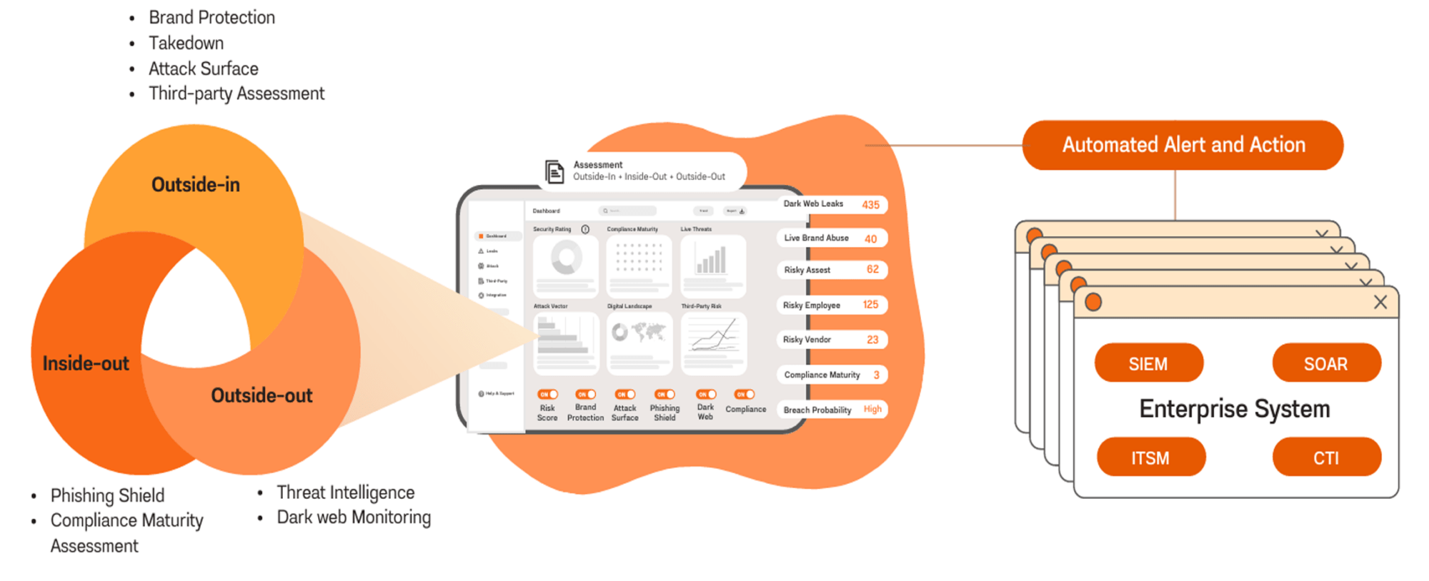 User-friendly dashboard, which allows businesses to easily visualize & understand their digital risk profile. This can help businesses make informed decisions about their security strategy & prioritize areas for improvement. Risk Score & Prioritization using single pane of glass for Digital Risk Measurement fast & simple.